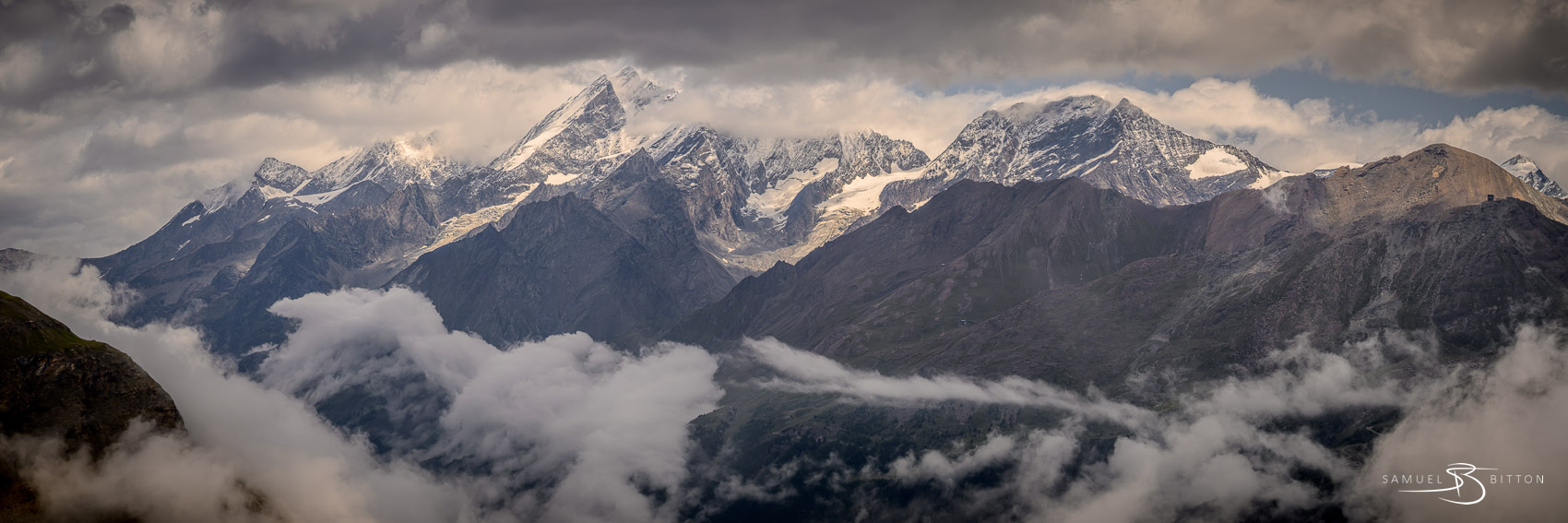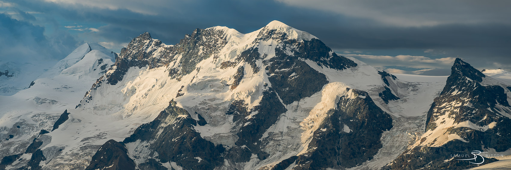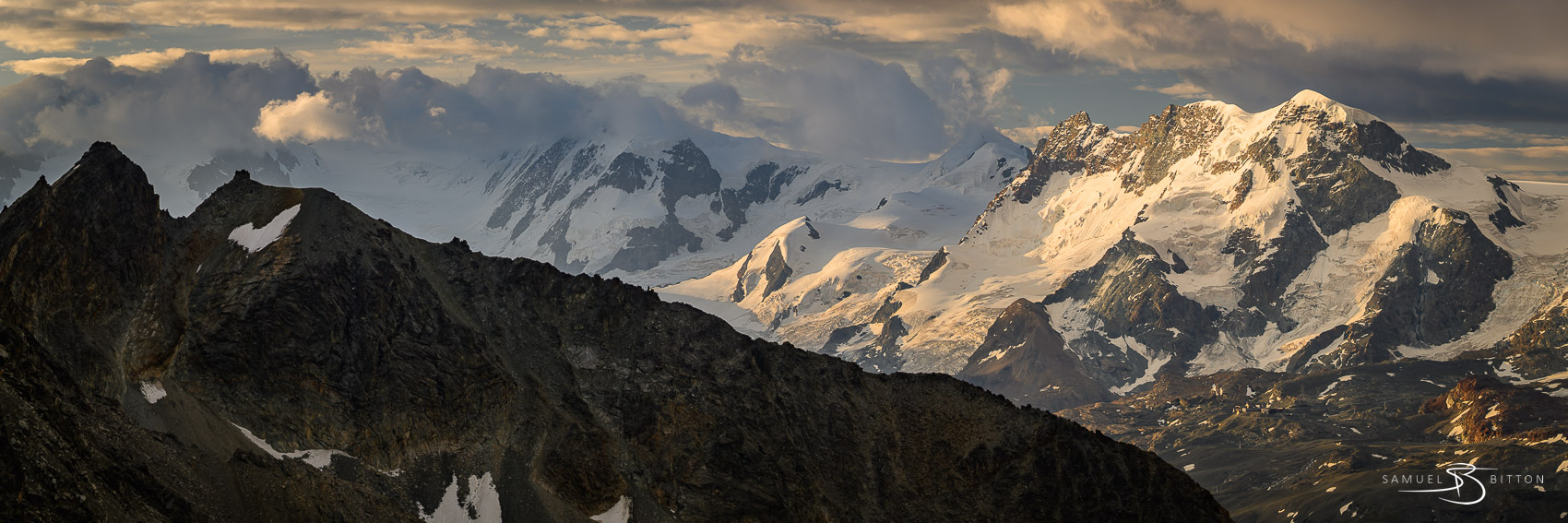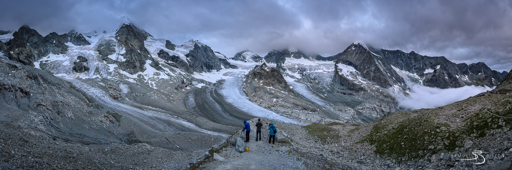 Le premier jour pour notre marche vers la cabane du Mont-Rose, nous avons bénéficié d'un temps couvert, mais sec, et le plafond nuageux était suffisamment haut pour profiter de tous les sommets. Le soir, le ciel s'est bien dégagé, ce qui nous a permis de réaliser quelques images nocturnes sous la lumière de pleine lune. Une telle séance photo à 3000m d'altitude dans un tel décor : ambiance garantie !