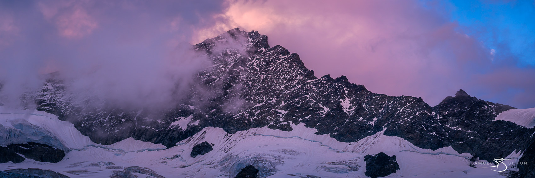 Lors de notre dernier coucher et lever de soleil depuis la cabane du grand Mountet, nous avons bénéficié de conditions plutôt nuages dont le plafond assez bas coupait le sommet de certains 4000, mais avec un peu de patience, au milieu de cette ambiance majestueuse, les cimes se sont brièvement révélées à nous pour notre plus grande satisfaction.