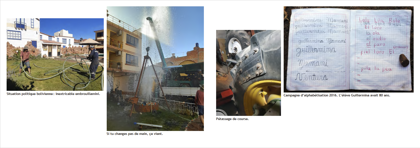 Organisée dans des conditions ubuesques à La Paz avec notre appui, Irène Delaveris a mené une expédition de quatre experts archéologico-toutistiques guidée pendant neuf jours par Johnny. Le tout est in extremis financé par Solidar Suiza, une émanation de la DDC. Nous sommes tout excités, ça fait 15 ans qu’on l’attend !